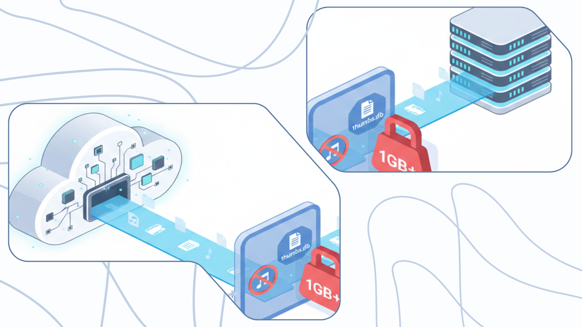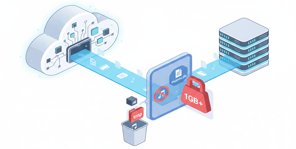 Cloud bloat occurs when temporary system files and forgotten massive archives accumulate over time. The primary offenders are often invisible to the average user: .tmp files, created by applications during active sessions, and thumbs.db, a Windows cache file used to store thumbnail previews of images. While these are useful locally, syncing them to the cloud is a waste of resources. Additionally, “forgotten giants”, large installers or raw video files, can eat up gigabytes of space in seconds if not filtered out.