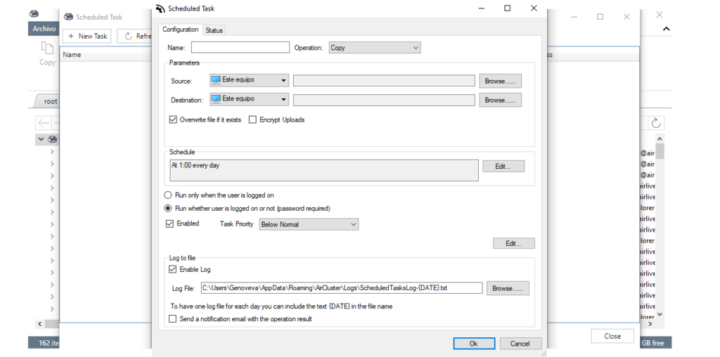 Yes, Air Cluster includes a built-in Task Scheduler. You can create a “New Task,” select your source and destination, and set a schedule (e.g., “At 1:00 every day”). The software can be configured to run these tasks ensuring automated and unattended backups.